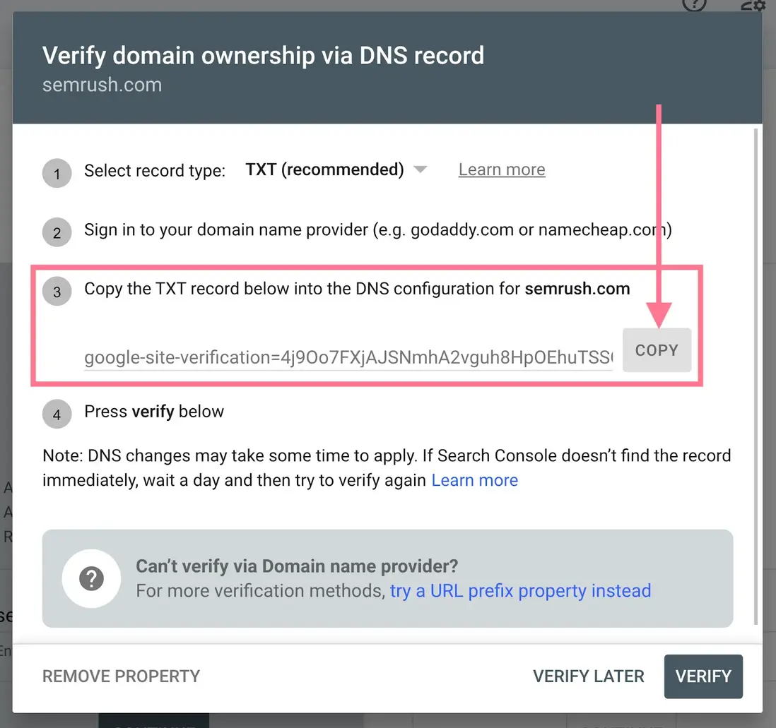 你需要把這個TXT記錄加到你的DNS服務商的解析裏面去,當添加完了域名解析這時候就直接點擊Verify(可能要等等,因為dns需要傳播)。完成後有個這樣的彈窗。
