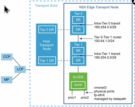 - 要了解 NSX Edge 網絡,您必須瞭解有關傳輸區域和 N-VDS 的內容。傳輸區域控制 NSX 中的第 2 層網絡的範圍。N-VDS 是在傳輸節點上創建的軟件交換機。N-VDS 的用途是,將邏輯路由器上行鏈路和下行鏈路綁定到物理網卡。對於 NSX Edge 所屬的每個傳輸區域,將在 NSX Edge 上安裝單個 N-VDS。