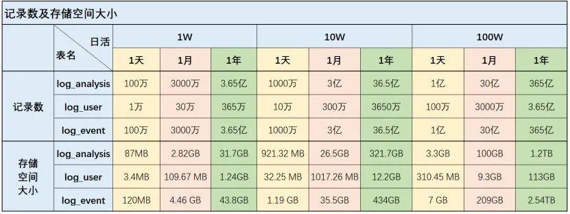 2)1萬/10萬/100萬日活數據,按每日人均100條採集日誌日庫,數據庫文件在1天、1個月、1年下的相關表的記錄總數核各個表的佔用的空間總量如下圖所示: