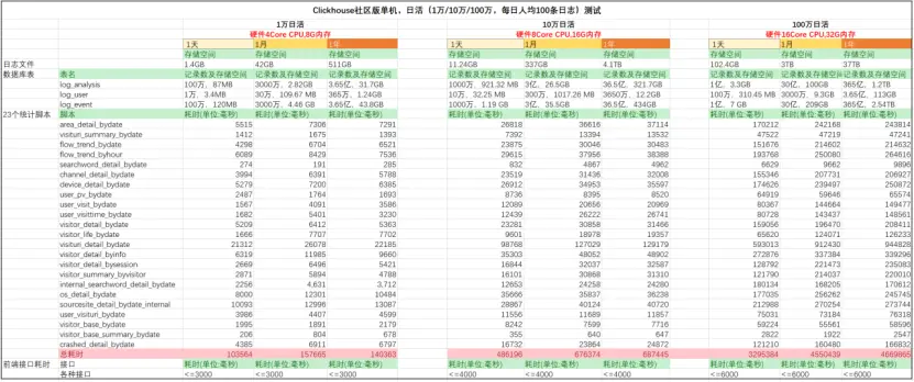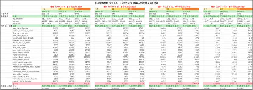 硬件以4Core CPU、8G內存為起點,日活以1萬起點,分別測試1萬/10萬/100萬,在阿里雲服務器上對ClkLog日活數據的Clickhouse社區自建版和Clickhouse企業版在單機和集羣模式下進行螺旋上升式測試。