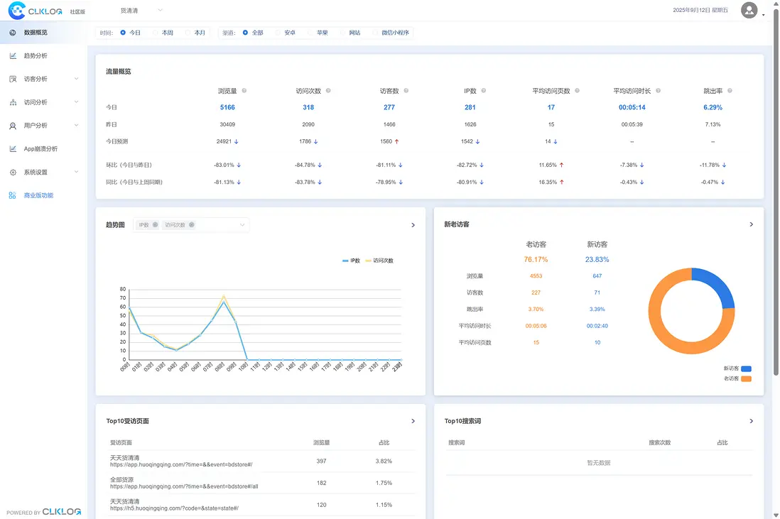 ClkLog既能滿足初創團隊快速搭建埋點系統的輕量需求,也能支撐大型企業構建更專業的用户行為分析體系,兼容跨端採集、事件分析、漏斗分析、用户分羣與畫像等高階運營場景。