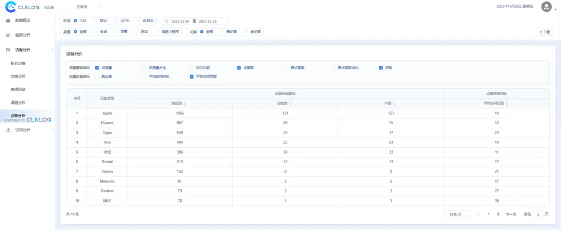 ➢ 【設備分析】從訪問設備角度統計各項訪問流量指標,適用於判斷用户使用環境。