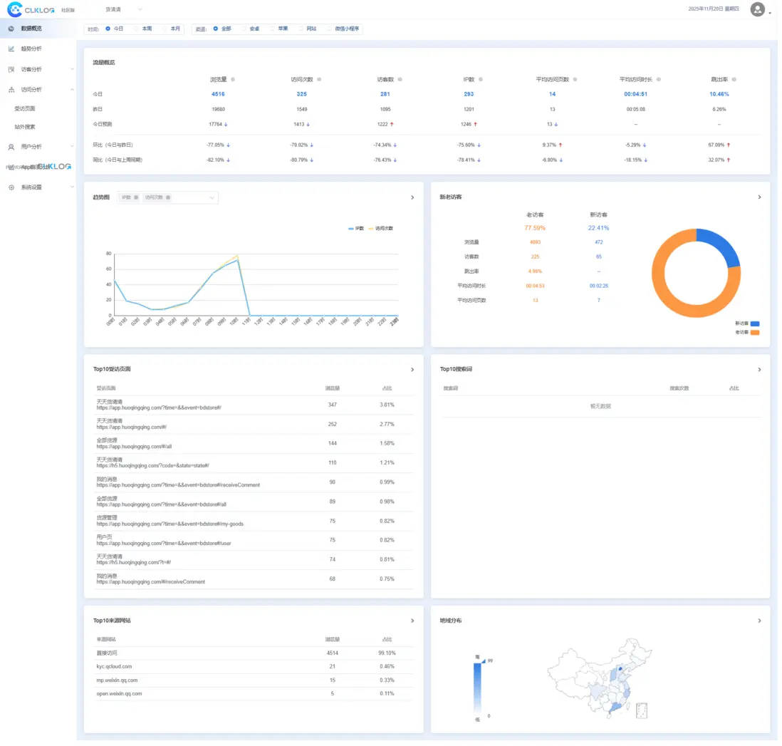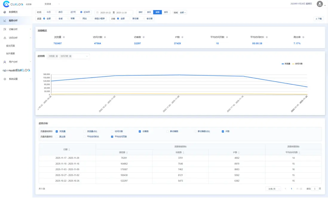 ClkLog是一款可私有化部署的開源用户行為數據分析系統,支持 Web、App、小程序、鴻蒙 OS 等端的事件埋點採集,內置多種主流分析模型,幫助團隊快速搭建自有埋點分析平台,實現訪問統計、事件分析、用户畫像等能力。