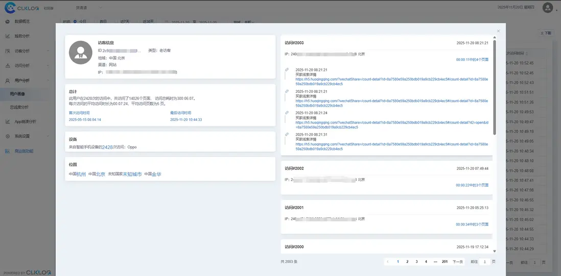 ➢ 【用户畫像(社區版)】彙總用户的基礎訪問信息、訪問信息總數、設備、位置與訪問歷史,可以快速瞭解用户特徵。