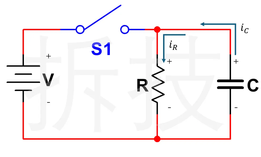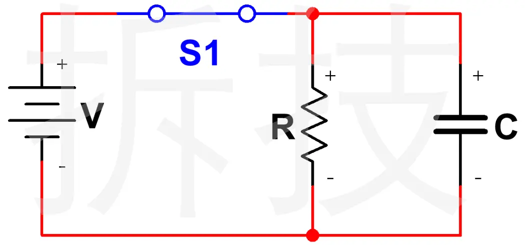 在$t_0$時刻前開關一直處於閉合狀態,,系統整個狀態穩定,此時,C電容兩端電壓$V$