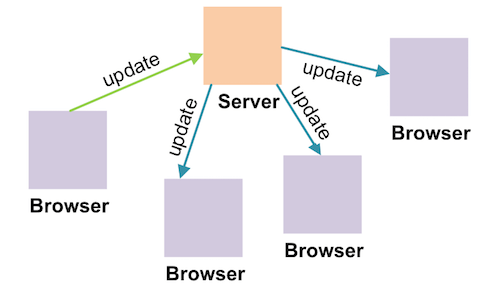 An established messaging pattern for handling updates to many clients is PubSub. Here, a client would declare an interest in a topic (“subscribe”) with a central broker. When the client sends an event for a topic to the broker (“publish”), the broker would distribute this event to all currently connected and subscribed clients.