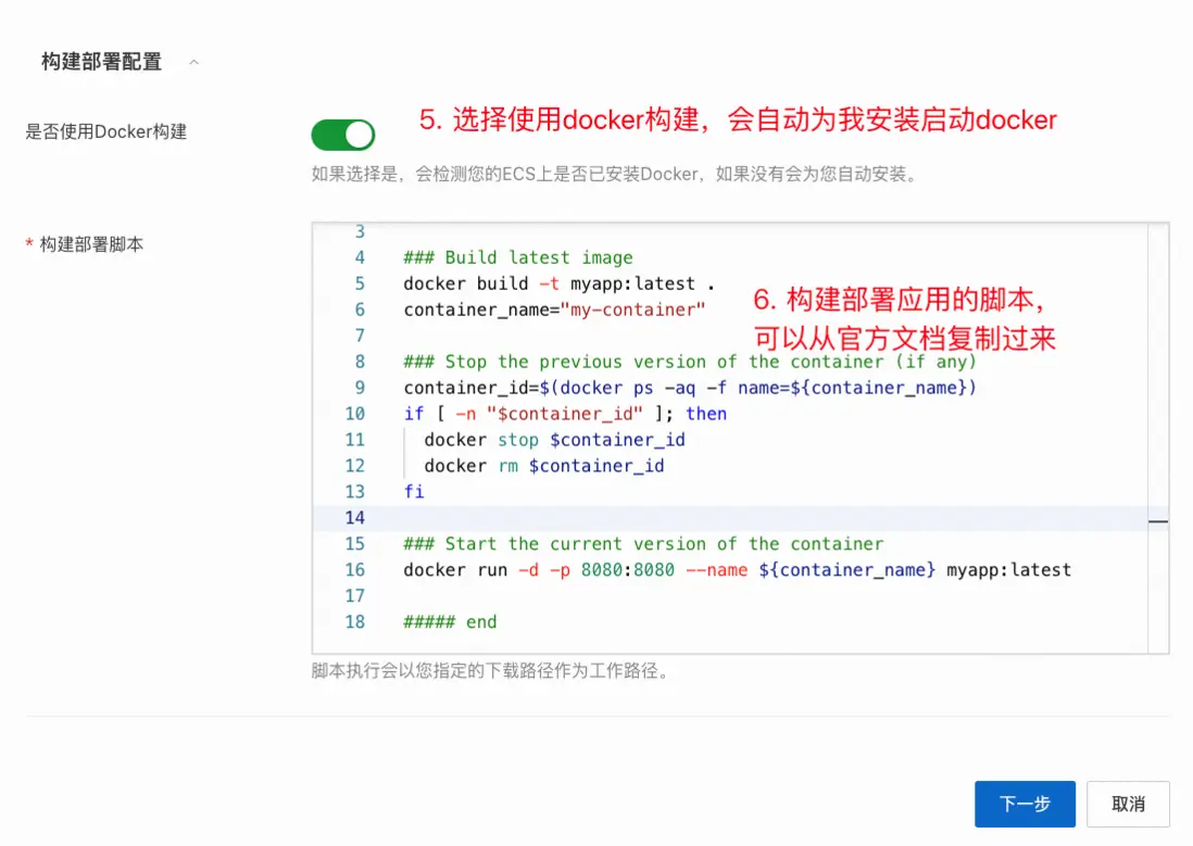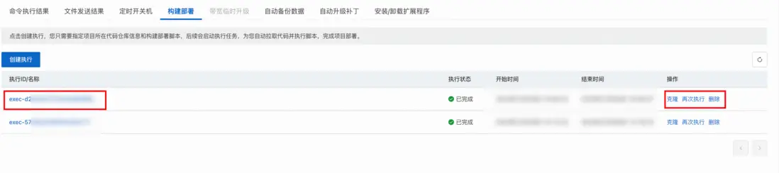 - 點擊下一步確定,即可開始執行構建部署。這個執行會拉取你指定的倉庫代碼到ECS上,並在代碼根目錄運行構建部署腳本。過程中會自動檢測並安裝git,docker,自動幫你git clone代碼等等。