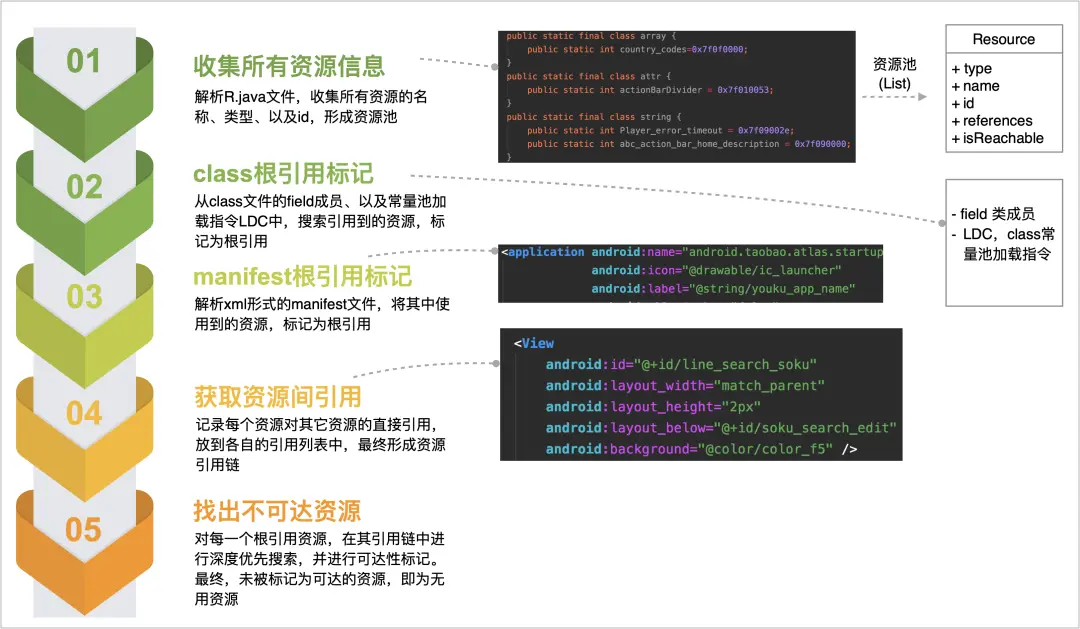 以java代碼和manifest作為引用根節點,對資源引用關係進行完全展開,最終未被包含到的資源,即為無用資源。對於通過Resources.getIdentifier這種間接(動態)方式引用的資源,不包含在此處的資源引用關係計算過程中,因此,無用資源檢測結果,需要確認是否存在這種引用方式。基於google官方AndroidGradlePlugin中的無用資源分析邏輯,全方位增強對工程結構、AndroidGradlePlugin版本、各工具鏈版本等兼容性,補齊更多類型資源間的引用分析,添加額外模塊歸屬信息,最終沉澱為此無用資源檢測功能。