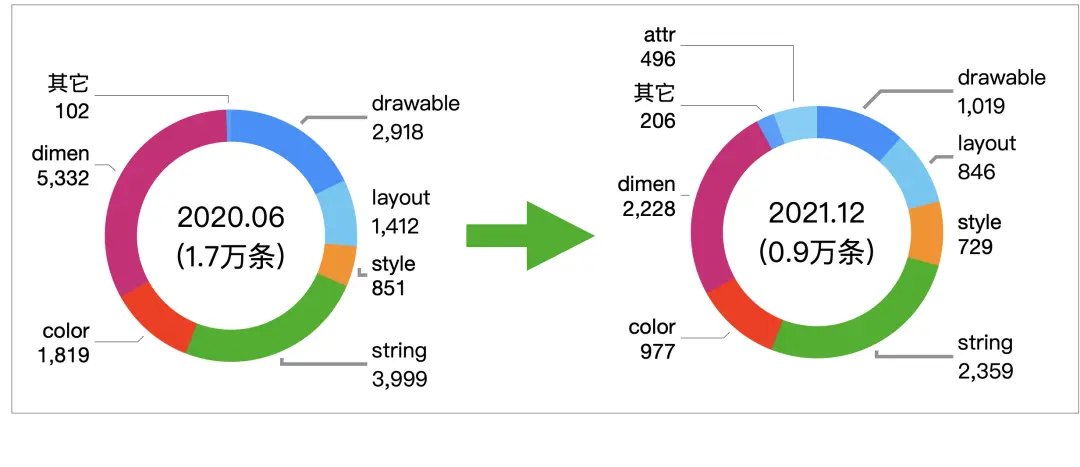Android資源從定義和使用方式來看,可以分為Resource和Asset兩個大類。前者提供受控的結構化訪問方式,每個資源均有唯一id標識,以及多種配置限定符來支持多語言、多設備、多特性等能力;後者提供原始且相對自由的目錄和文件訪問。Resource類型是絕大部分資源使用場景下的最佳選擇,本文主要聚焦的即是這種類型資源,對衝突、無用、缺失類引用、硬編碼文本,這幾種腐化情況,開展工具研發,以及治理實踐。