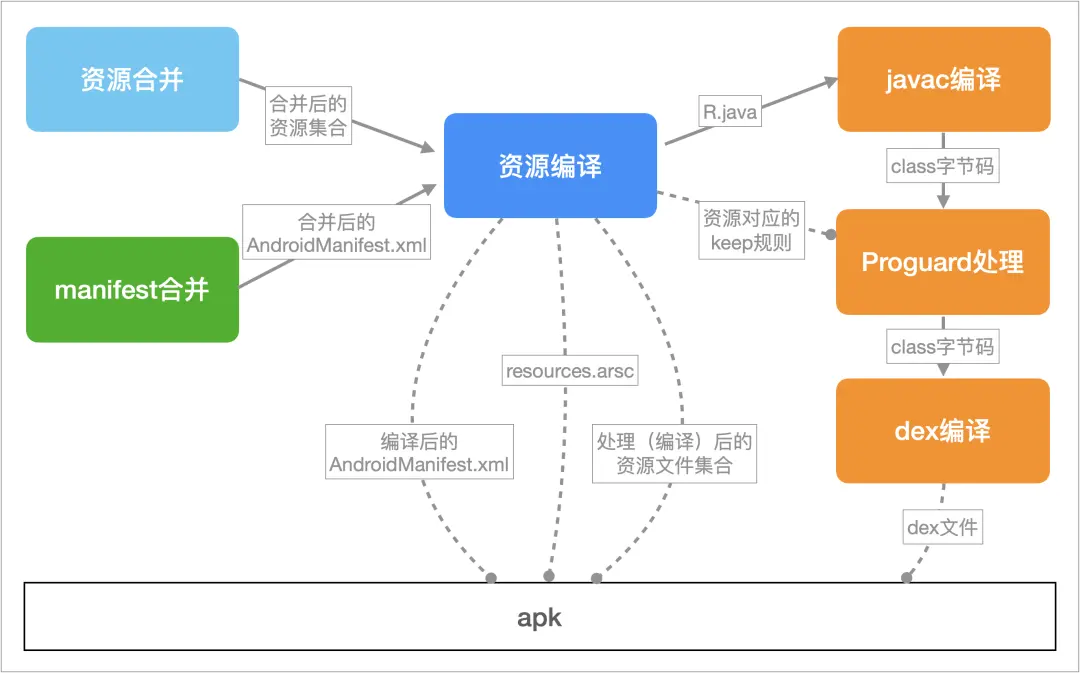首先,資源會進行合併,同名資源僅保留一份,同時,manifest也會進行合併。接下來,會以上述二者作為核心輸入數據,通過AAPT(2)進行資源編譯,具體的編譯過程比較複雜,網絡上也有比較全面的講解(可以參考這篇文章:https://www.kancloud.cn/alex_...), 這裏重點關注資源編譯產物,以及與其它處理邏輯的關係: