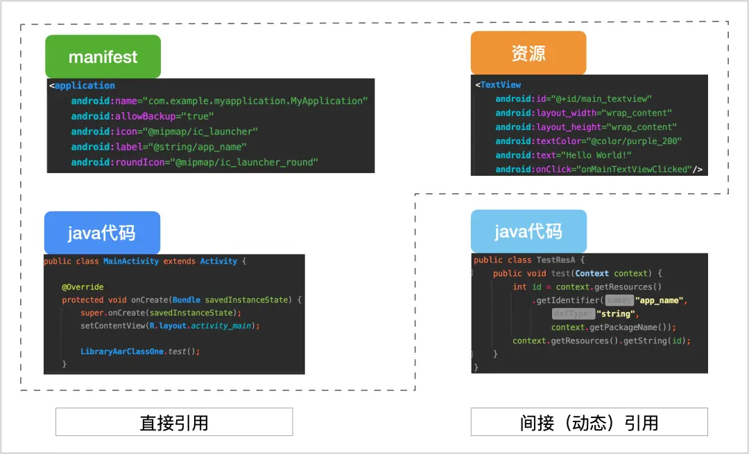 資源在定義後,就需要從另外的地方對其進行引用。從引用確定性這個維度來看,可以分為直接和間接(動態)兩種;從引用元素為度來看,可以分為java代碼、manifest、資源三種: