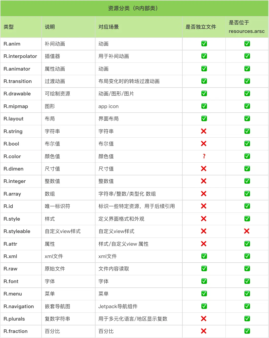 對於Resource資源,按照使用場景,官方文檔已經給出了劃分和具體説明。本節以資源編譯後,對應R內部類的類型,給出一個分類: