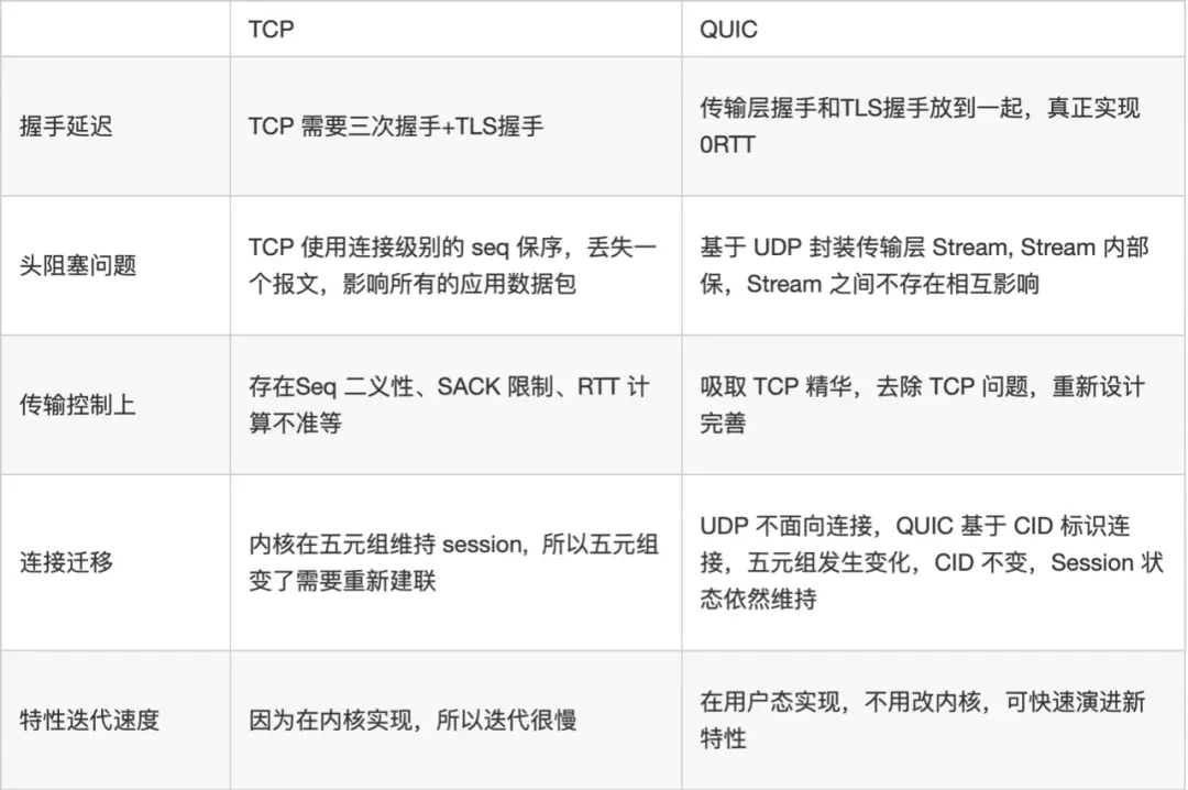 - 除此之外,當應用層協議優化到 TLS1.3、 HTTP2.0 後, 傳輸層的優化也提上了議程,QUIC 在 TCP 基礎上,取其精華去其糟粕具有如下的硬核優勢: