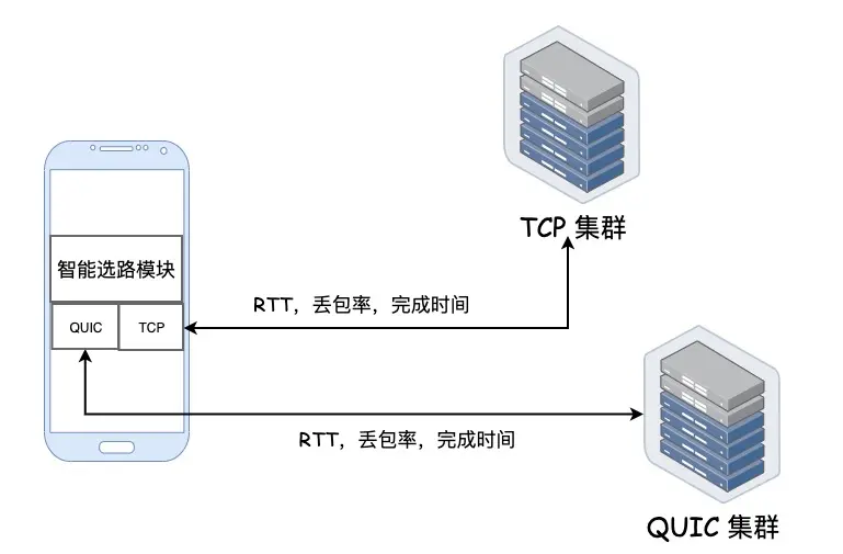 同時,根據觀察發現,不同的手機廠商對於 UDP 的支持能力也不同,所以在落地過程中,如果盲目的將所有流量完全切為 QUIC 可能會導致一些難以預料的結果。為此,我們在客户端上,設計了開篇介紹的 TCP 和 QUIC 相互 Backup 的鏈路,如下圖所示,我們實時探測 TCP 鏈路和 QUIC 鏈路的 RTT、丟包率、請求完成時間、錯誤率等指標情況,並根據一定的量化方法對兩種鏈路進行打分,根據評分高低,決定選擇走哪種鏈路,從而避免尋址只走一條鏈路導致的問題。
