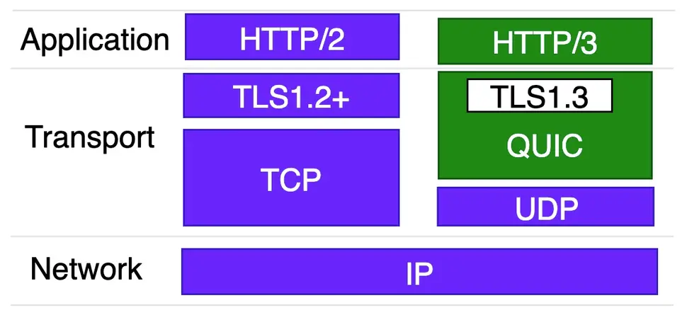 簡單來説,QUIC (Quick UDP Internet Connections) 是一種基於 UDP 封裝的安全 可靠傳輸協議,他的目標是取代 TCP 並自包含 TLS 成為標準的安全傳輸協議。下圖是 QUIC 在協議棧中的位置,基於 QUIC 承載的 HTTP 協議進一步被標準化為 HTTP3.0。