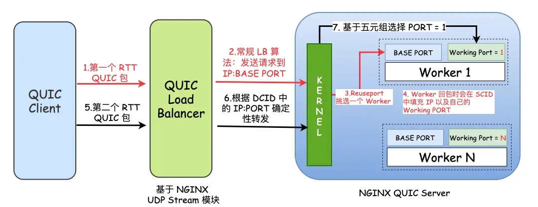 - BASE PORT ,每個 Worker 使用的相同的端口號,以 Reuseport 的形式監聽,並暴露給 QUIC LB,用以接收客户端過來的第一個 RTT 中的數據包,這類包的特點是 DCID 由客户端生成,沒有路由信息;