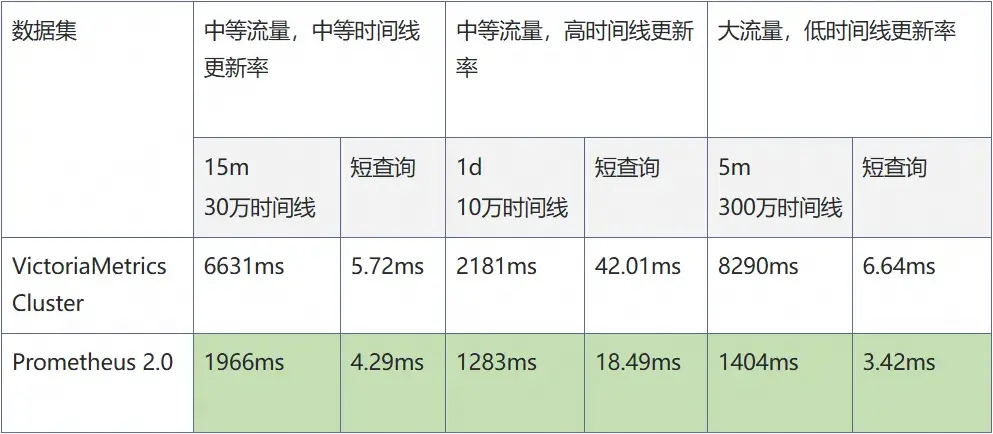 在線上一些典型的查詢場景,目前 Prometheus 2.0 和 VictoriaMetrics 的查詢延遲如下: