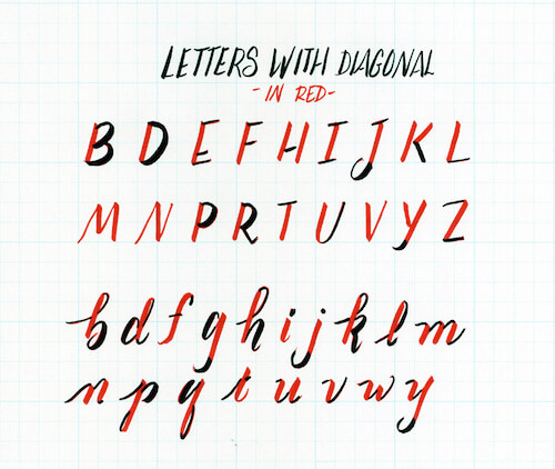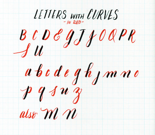 Now that we have the basics covered, let’s talk about how to make the letters. You will find a diverse range of opinions on whether or not practicing each letter is beneficial. I would prefer to point your attention to the fact that the letters are made out of groups of shapes. In other words, letters are like a large family and some letters have more commonalities than others. If you study them as groups of similar shapes, your foundation will be more solid because your letters will be more consistent.