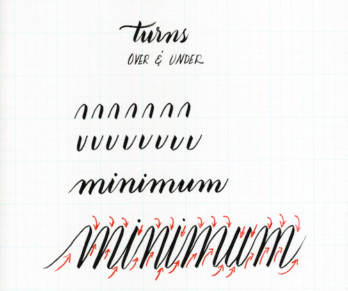 In addition to the principles or basic strokes, there are two turns that are very important: the under turns and over turns. These turns give you the line and place which allow you to connect the letters. Generally, these turns will need the most practice as your brush pen will either press on or be lighter on the page.