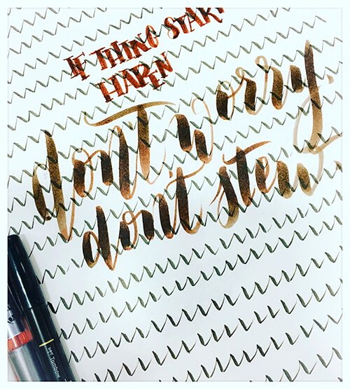 I had taken a short course offered by Caroline Kelso from Made Vibrant, where she teaches a simple way to do lettering. I started to realize that one thing that all lettering styles had in common, among the sea of differences and uniqueness, was that everybody would embrace their own style. That was the moment when I decided to try different tools and see what I was most comfortable with and what I liked the most. Eventually, I started to settle on brush lettering.