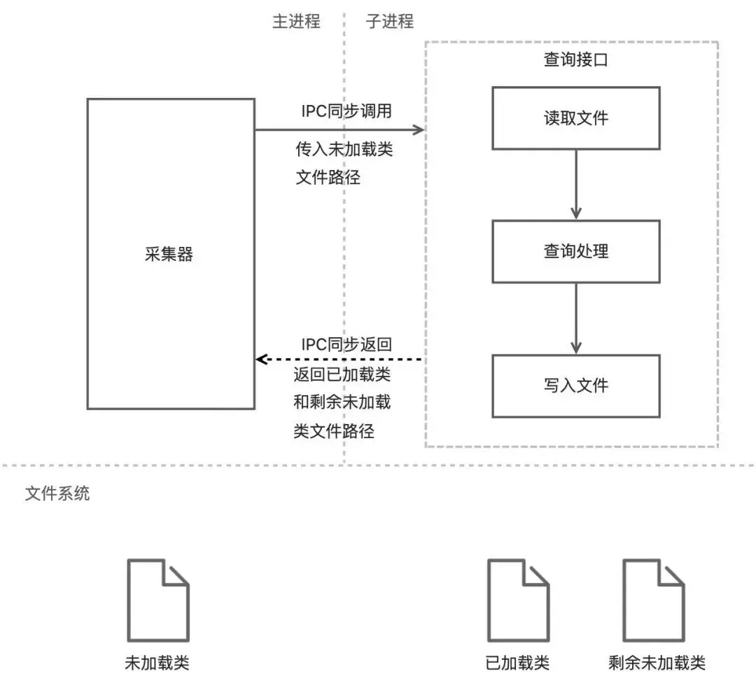 同時考慮到跨進程的成本較高,如果對每個類都調用一次查詢接口,無疑是難以接受的。於是我們想到了文件+批量查詢的方式:利用文件作為數據載體,將已加載的類和未加載的類都寫入到文件中,在接口間傳遞文件路徑。文件操作還可以採用BufferedReader和BufferedWriter以提升性能。