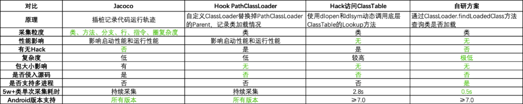 通過雲控中心,我們可以控制是否啓用覆蓋率採集,也可以根據覆蓋率(類使用頻次)動態調整App中金剛位、線程等資源的調度分配策略。其中覆蓋率採集方案是最為重要的一環,業界也有很多成熟的方案,但都有各自適合的場景,而我們的訴求是在儘量不影響用户使用和App運行的前提下,採集類粒度的代碼使用覆蓋率。使用的採集方案應該少Hack,實現簡單,兼顧穩定性和性能,同時也不會侵入打包流程,帶來包體積影響等,在經過深入探索後,我們自研出了一套完美滿足這些要求的全新方案。