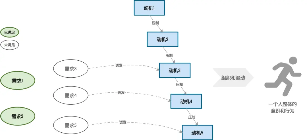 提到人性,就會提馬斯洛需求層次模型。儘管每個人所處的環境、接觸的信息、個人的觀念各有不同,需求層次模型也會有千差萬別,但是從公司、組織和員工的角度來看,這一模型相對穩定清晰。動機的搶佔模型也可以理解為需求的壓制模型如下圖: