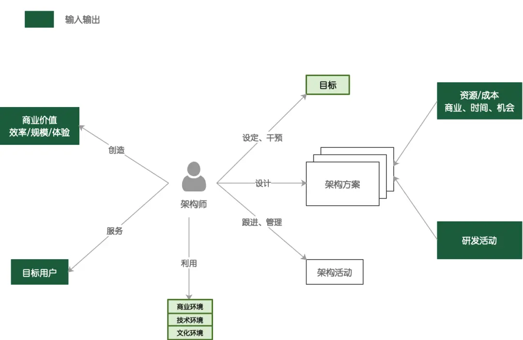 按這張圖理解,架構是指架構師以商業價值為導向、以用户為核心,在所處的商業、文化、技術環境中,利用有限的資源和成本,設計架構方案、組織或參與研發活動,從而達到既定目標的一項複雜且持續的活動。
