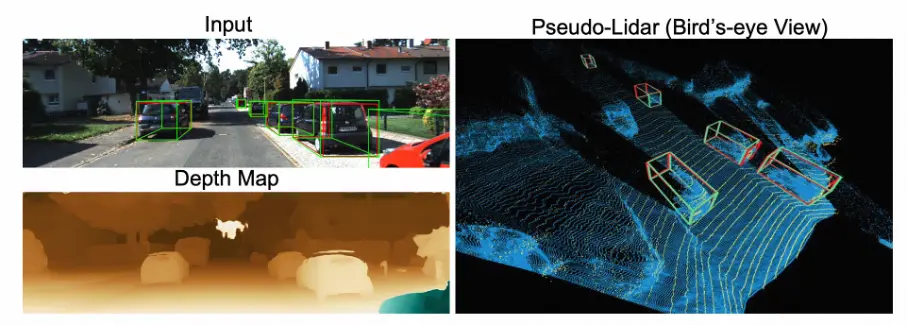 圖1‑4 Pseudo-LiDAR示意,預測深度圖,根據原始圖像和深度圖映射至3D空間[4]
