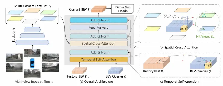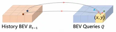 BEVFormer的核心是中間的BEV特徵編碼模塊,BEV特徵編碼模塊的核心是時序自注意力(Temporal Self-Attention)和空間交叉注意力(Spatial Cross-Attention),時序注意力是為了利用歷史幀BEV特徵增強當前幀BEV特徵,空間交叉注意力則是為了從圖像特徵獲取信息。