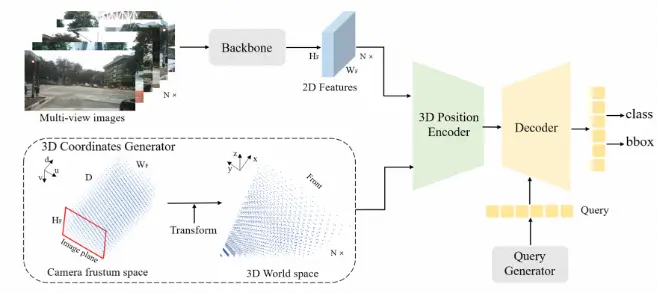 3D->2D的方案一般都需要將參考點投影到PV空間,再取圖像特徵,PETR避免了複雜的3D->2D轉換及特徵採樣,直接讓網絡自己學習2D-3D的映射。PETR的框架如圖2‑10所示,包括圖像特徵編碼器、3D座標生成器、3D特徵編碼器(3D Position Encoder)、3D特徵解碼器和檢測頭。圖像特徵編碼器大同小異,不再贅述。