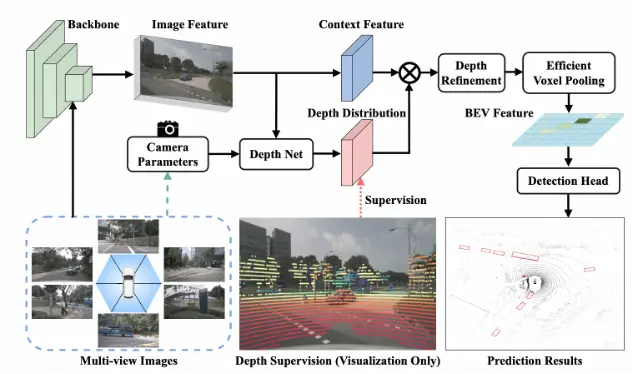 作者實驗發現LSS估計的深度替換成隨機值影響不大,而採用真值深度對指標提升很大,因此得出LSS估計深度不準的結論,如圖2‑2所示,在沒有明確的深度監督的情況下,很難輸出準確,泛化性強的深度感知結果,要想獲得更好的檢測結果,需要更準的深度,因此引入深度監督訓練深度子網絡。