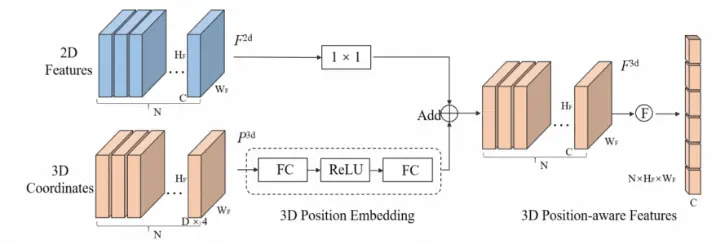2D圖像特徵和3D座標一起送入到3D特徵編碼器中,2D特徵進行卷積通道降維,3D座標進行位置編碼,然後將處理後的2D特徵和3D座標編碼整合,最後特徵展平。