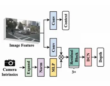 視角轉換模塊的核心是深度估計,深度估計網絡DepthNet的框架如圖2‑4所示,首先使用MLP對相機內參進行特徵化,然後用SE (Squeeze-and-Extraction) 對圖像特徵進行通道加權,然後經過3個殘差塊以及可形變卷積,得到深度。深度再與圖像特徵進行外積,得到3D視錐特徵。