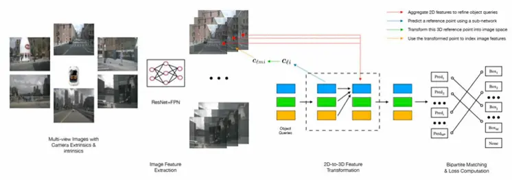如圖2‑5所示,Detr3D是Detr在3D目標檢測的擴展,也是使用query進行特徵獲取,然後進行檢測。Detr3D的圖像特徵編碼器大同小異,不再贅述。