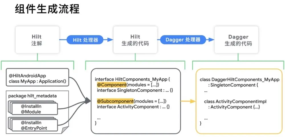 從這裏開始,Dagger 處理器接管並根據 @Component 和 @Subcomponent 註解生成組件的具體實現。如果您曾使用過 Dagger (不通過 Hilt),那麼大概率您已經直接處理了這些類。但是,Hilt 對開發者隱藏了這種複雜操作。