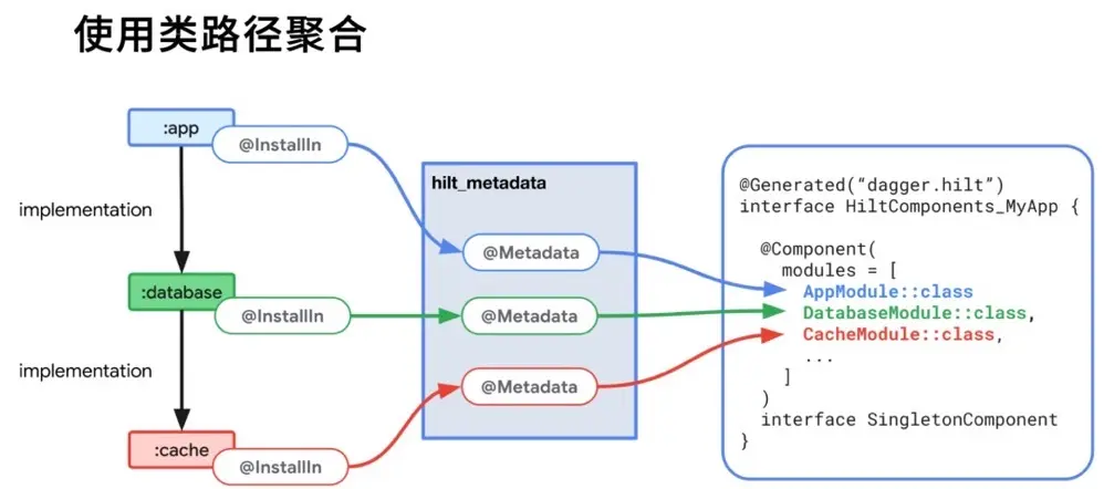 為了生成這些組件,Hilt 在上述元數據包中查找所有被添加 @InstallIn 註解的類。添加了 @InstallIn 註解的模塊被放置在相應組件聲明的模塊列表中。添加了 @InstallIn 註解的入口點被放置在聲明相應組件的父類型的位置。