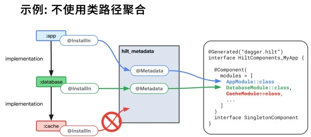 當 :cache 被編譯時,雖然它會生成元數據,但在編譯 :app 時該元數據無法使用,因為它是一個傳遞依賴項。因此,Hilt 無法知曉 CacheModule,它會意外地從生成的組件中排除。