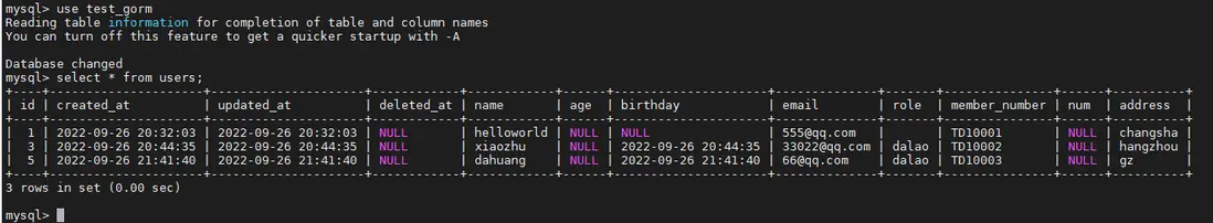 在 GO 中我們訪問 mysql 關係型數據庫,數據庫中提前先創建好了數據庫,數據表,以及 3 條記錄