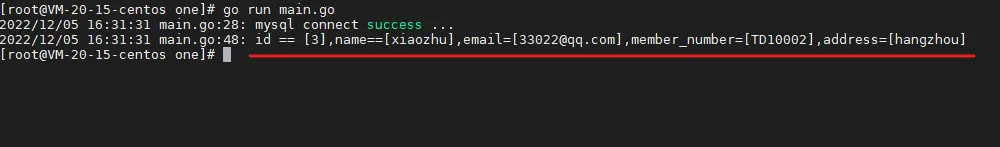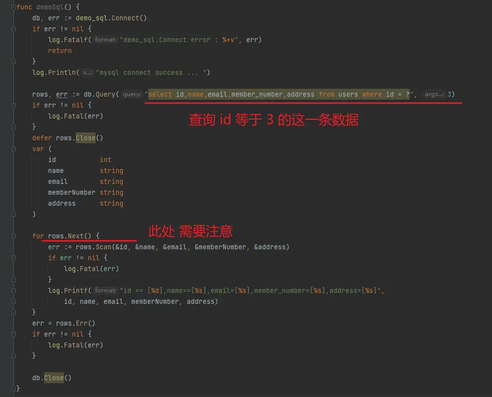 可以發現,本次的查詢語句是 select id,name,email,member_number,address from users where id = ? ,我們再一條數據一條數據的讀取出來(此處需要注意使用讀取 rows.Next() 的時候,需要讀取完畢之後,關閉句柄,否則會資源泄漏