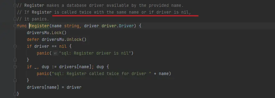 可以看到 mysql 包中的 init 函數,實際上就是做一個註冊,用一個有效的名字,對一個這一個數據庫引擎