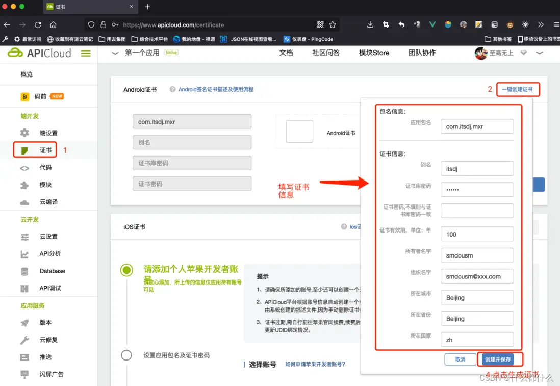 選擇「證書」-> 「一鍵創建證書」-> 在彈出的界面內填寫內容後,點擊「創建並保存」,完成證書的創建。