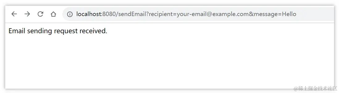 現在,你可以運行 Spring Boot 應用程序。應用程序將啓動,並且可以通過訪問http://localhost:8080/sendEmail或者http://localhost:8080/sendEmail?recipient=your-email@example.com&message=Hello來觸發電子郵件發送請求。