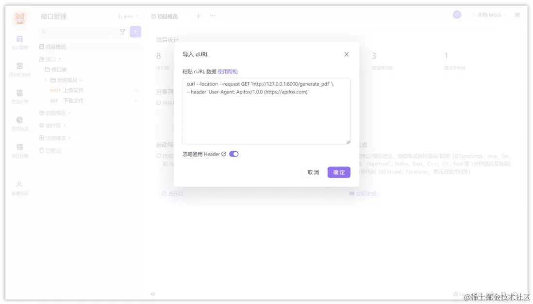 Apifox 會將命令解析成接口,生成快捷請求,你可以直接“發送”進行測試,或保存為接口。