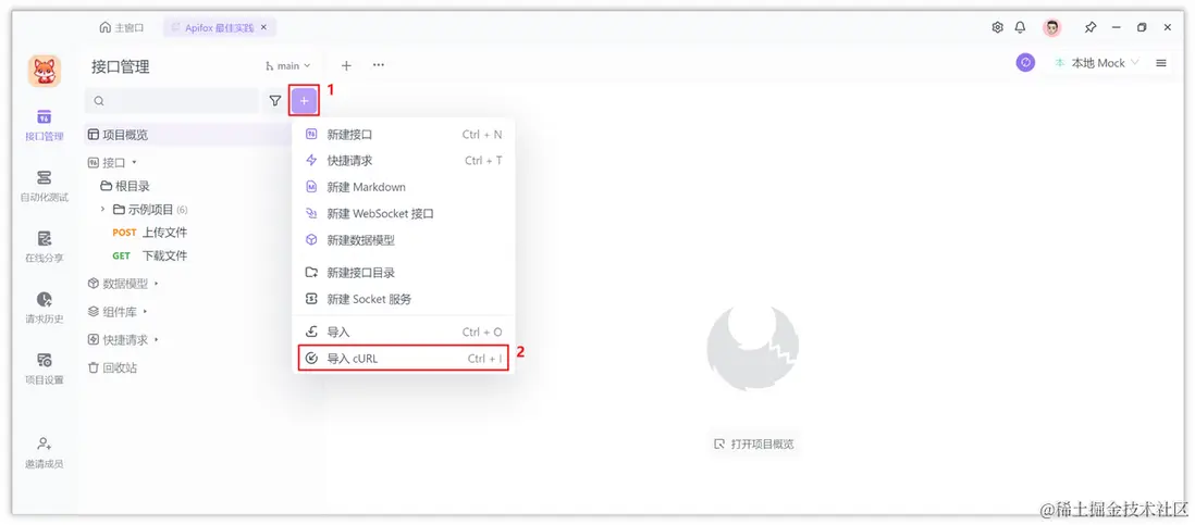 在 Apifox 中運行 cURL 命令非常輕鬆。創建一個新的 HTTP 項目,移動到+號圖標處,點擊"導入 cURL"打開輸入框。