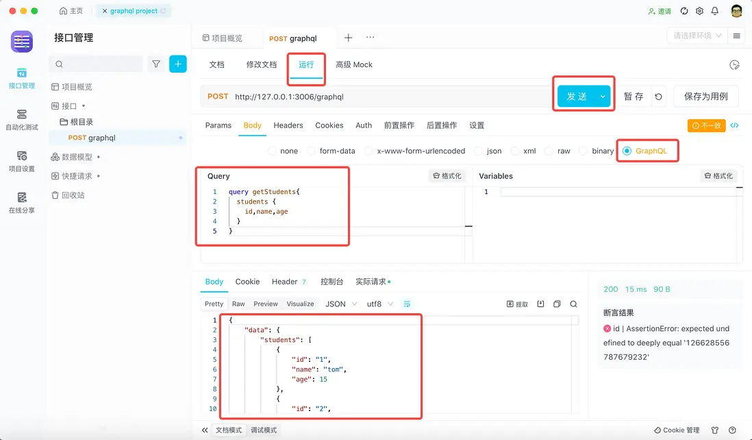 我們先查出所有的學生,我們需要跳到 運行 頁面,並選擇對應的 Body 類型,填寫 query 語句,然後點擊 發送 按鈕,得到查詢結果,符合我們的預期。