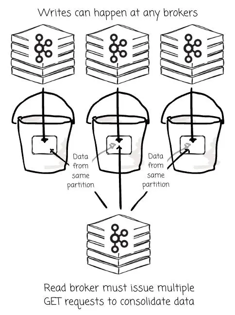 當任意 Broker 隨時都能向同一分區寫入數據時,該分區的數據就會被打散,以碎片化的形式分佈在 S3 的大量小對象中,而這些對象又是由不同的 Broker 各自生成的。