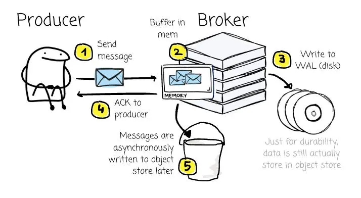 向對象存儲寫入數據的速度,無疑要慢於本地磁盤。一些 Diskless Kafka 方案選擇了犧牲低延遲性能:它們必須等到消息在對象存儲中完成持久化後,才會向生產者返回確認(ACK)。