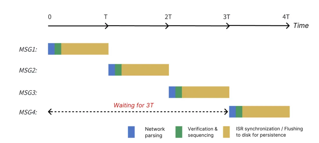 - 串行性(Serial): 服務端只有在完全處理完當前請求併發送響應後,才會開始處理下一個請求。這意味着,即便客户端併發發送了 N 個 ProduceRequest,服務端也會嚴格執行'One-by-One'策略:必須等到前一個請求的數據完成所有 ISR 副本同步並返回響應後,才會開始處理下一個請求。