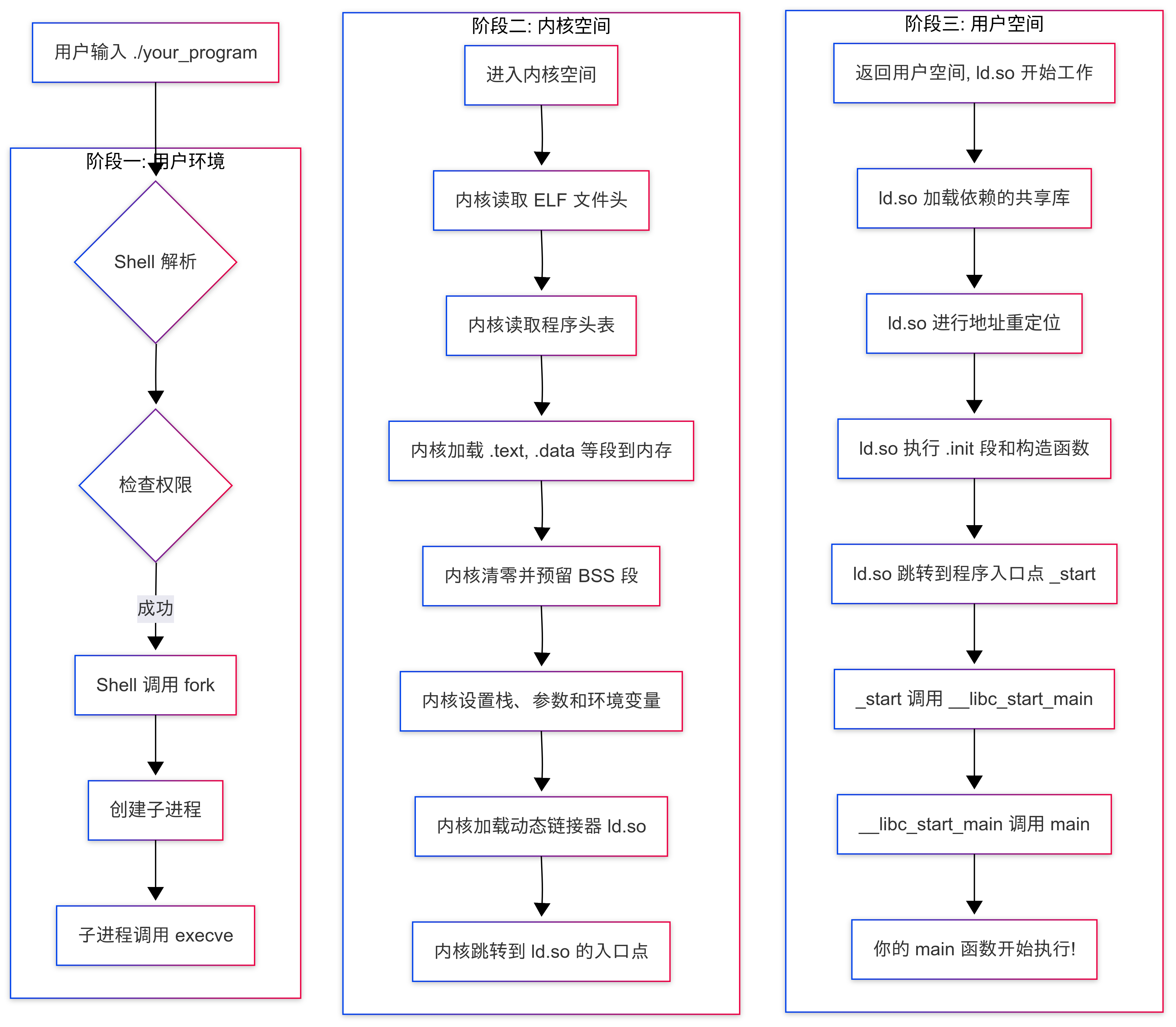 首先,根據 elf 加載流程,動態鏈接的地址重定位是在可執行文件執行過程中在內核分配完內存空間和棧空間之後,調用 ld.so 動態連接器,轉到用户空間加載依賴的共享庫,然後進行運行時地址重定位。最終跳轉程序入口,開始執行程序。